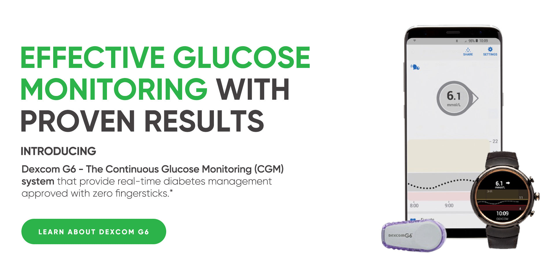 The Dexcom G6 Continuous Glucose Monitoring (CGM) System sends real-time glucose readings automatically to a compatible smart device** with no fingersticks* and no scanning. It is proven to lower A1C,1-5and features a 10-day sensor that is easy to use.6