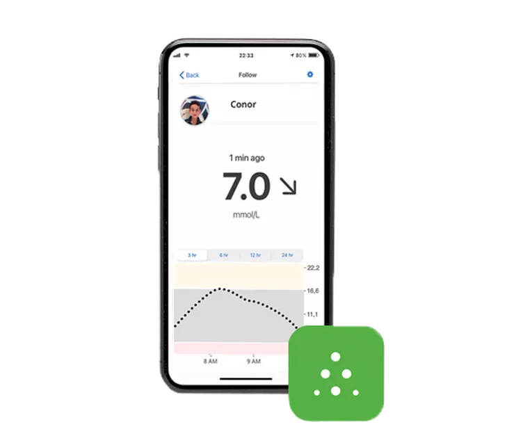 Whether near or far, up to 10 people can remotely monitor your glucose data and trends on their compatible smart device* by using the Dexcom Follow app. Once they have installed the app, you can invite them to start following you via the Share feature built into the G6 CGM app. With the Dexcom Follow app and an Internet connection, they will see the same glucose value, speed and direction data – and can customize their own settings to receive real-time alerts (at levels they choose – can be different from yours) as well as the Hypo Alarm at 3.1 mmol/L for added protection.